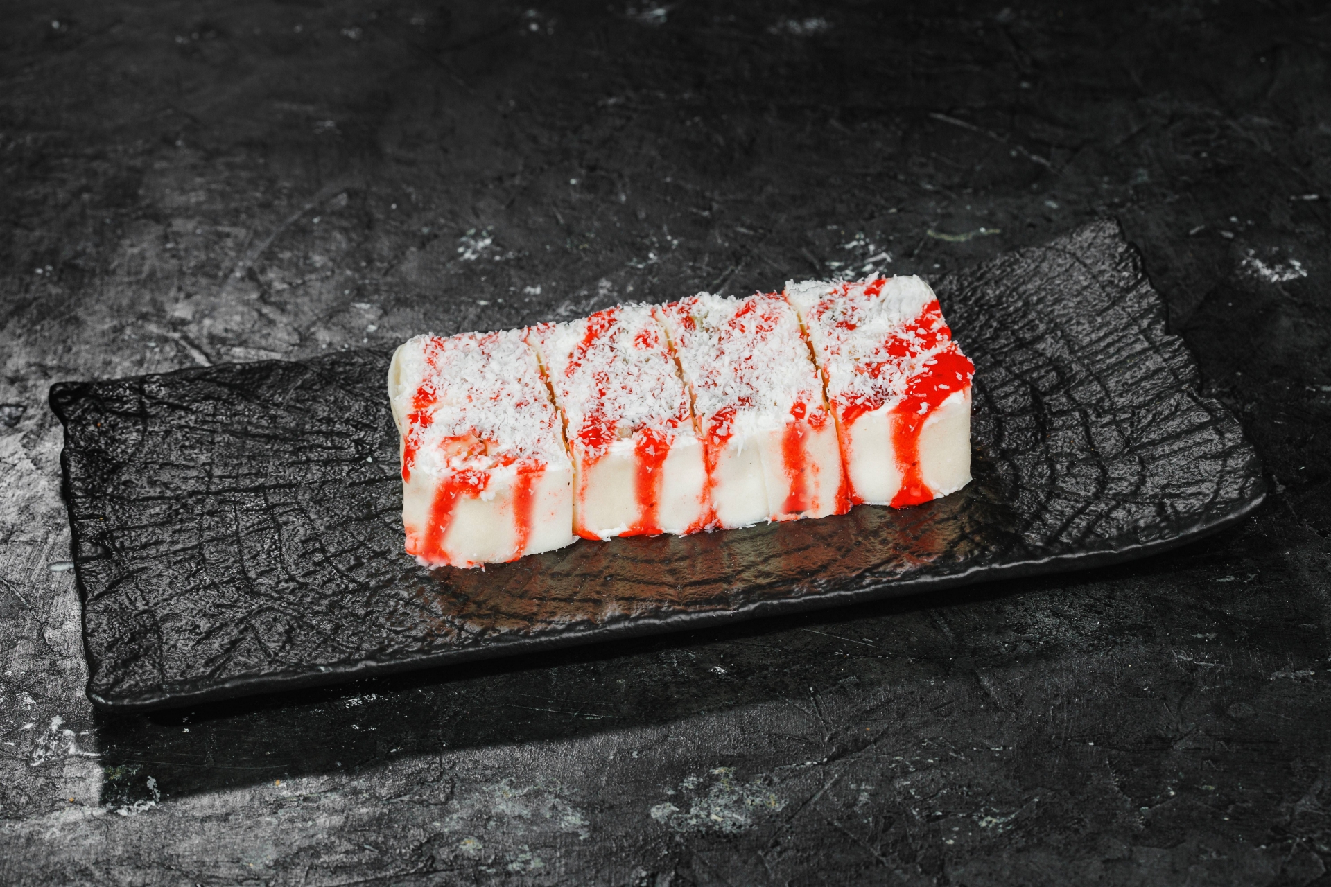 Состав : Спринг тесто, сыр творожный, банан, ананас, киви, топинг клубничный, кокосовая стружка.